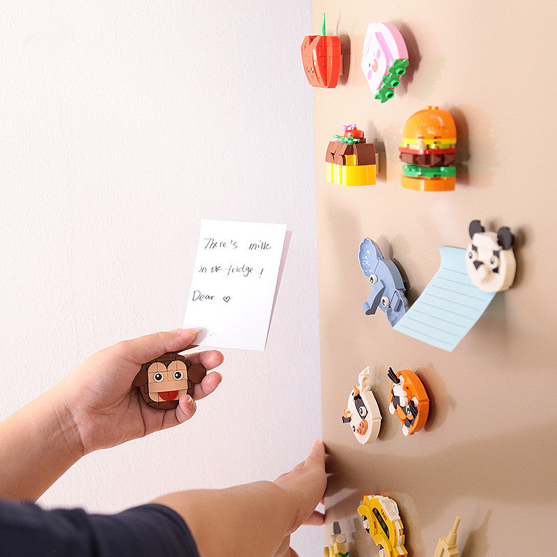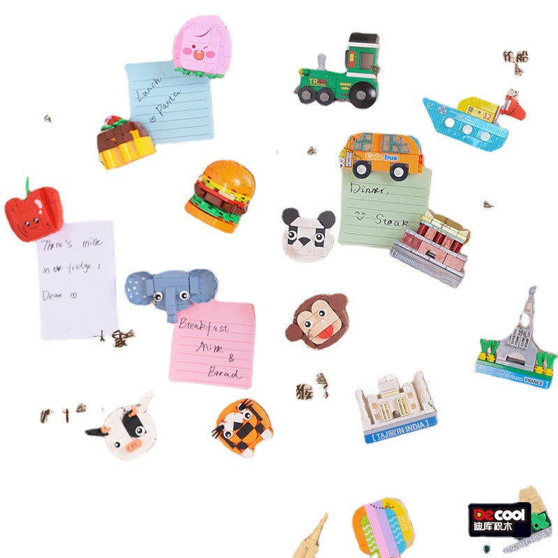 These small-particle plastic building blocks double as fridge magnets, allowing children to assemble animals, vehicles, fruits, or scenic designs. They encourage creativity, hand-eye coordination, and interactive play.
